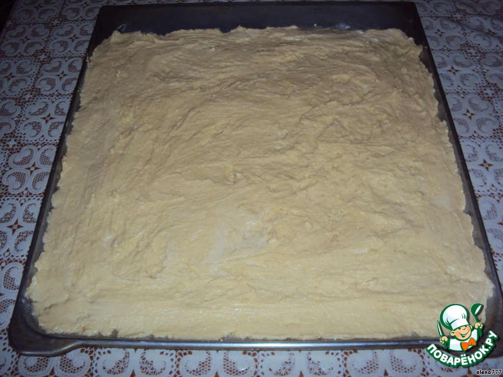 Выложить тесто на смазанный противень и размазать ложкой, смоченной в холодной воде.