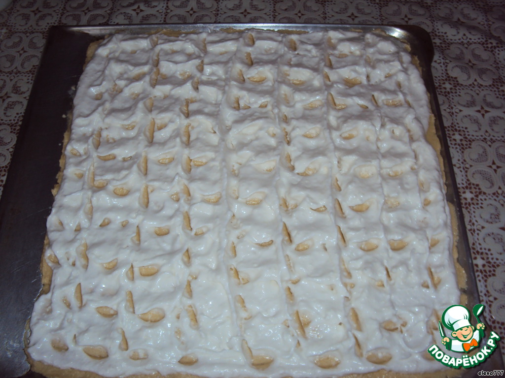 Белки взбить без сахара, затем взбивать, постепенно всыпая 1/2 стакана сахара. В конце всыпать кокосовую стружку, осторожно перемешать.