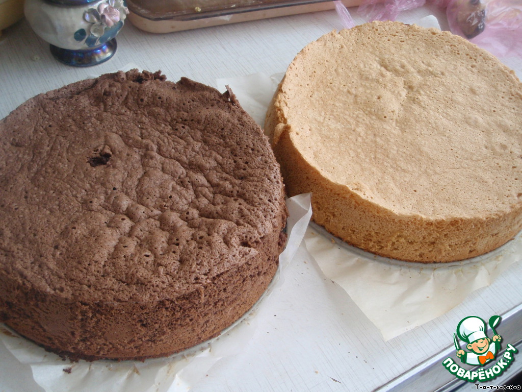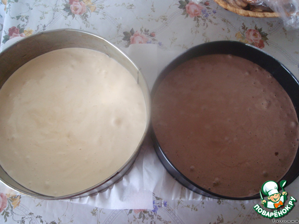 Точно такой же делаем второй корж, только в этот добавляем какао. Всегда пекла по отдельности, в этот раз очень спешила, попробовала испечь вместе