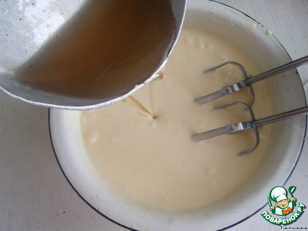 И маленькой струечкой вливаем в сметану. Сметану лучше брать не холодную, а комнатной температуры, так как в холодной желатин может образовать комочки. И взбиваем миксером.
