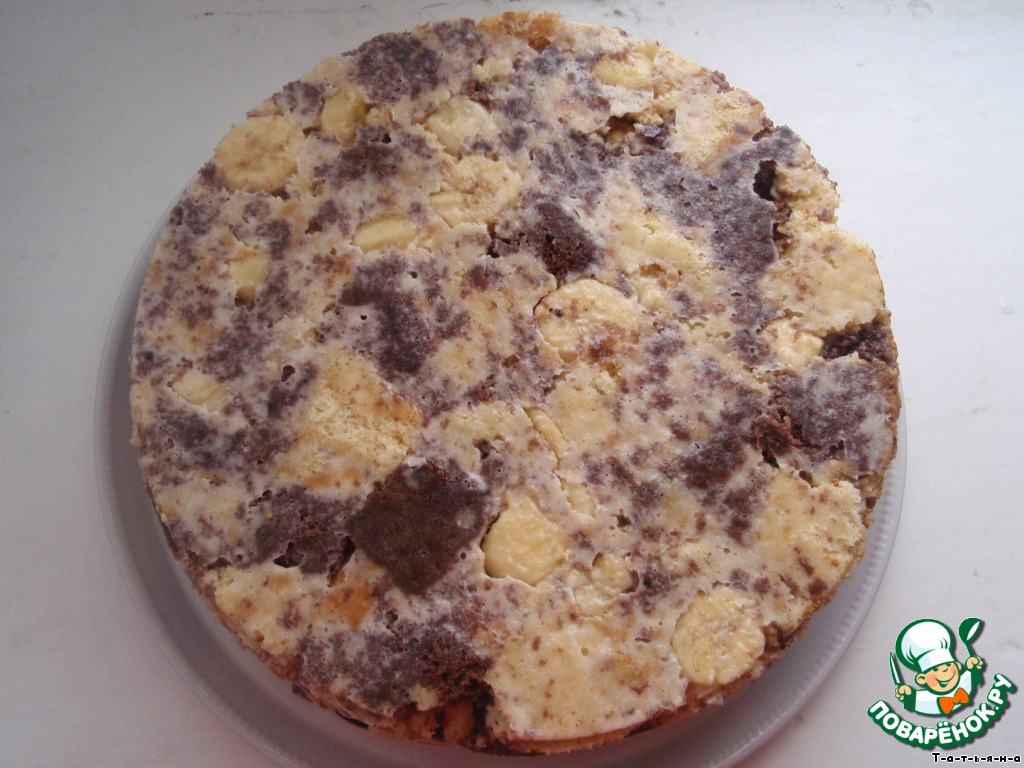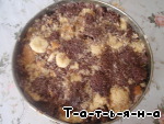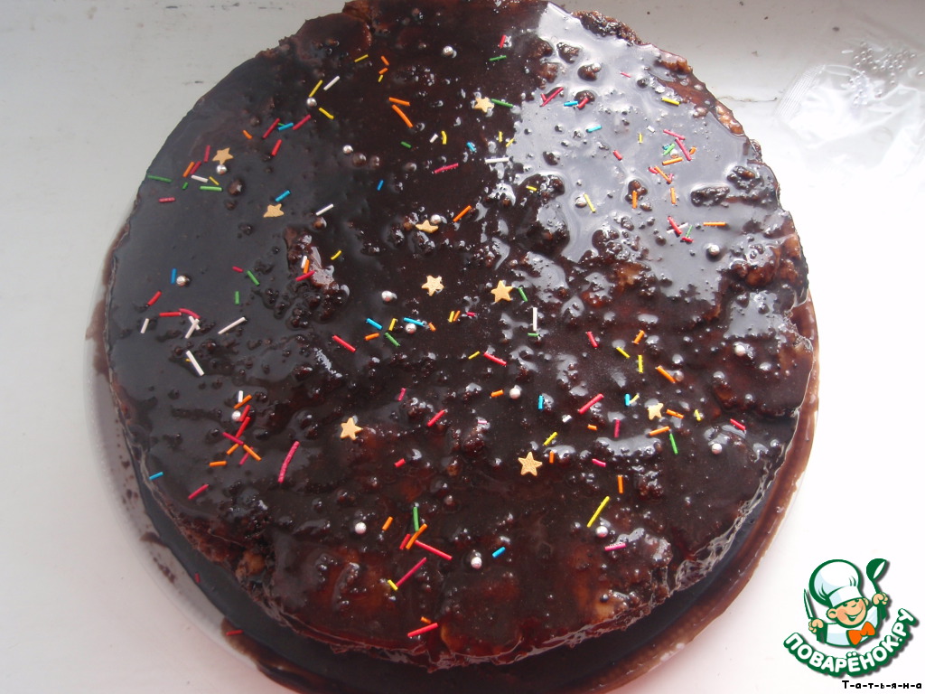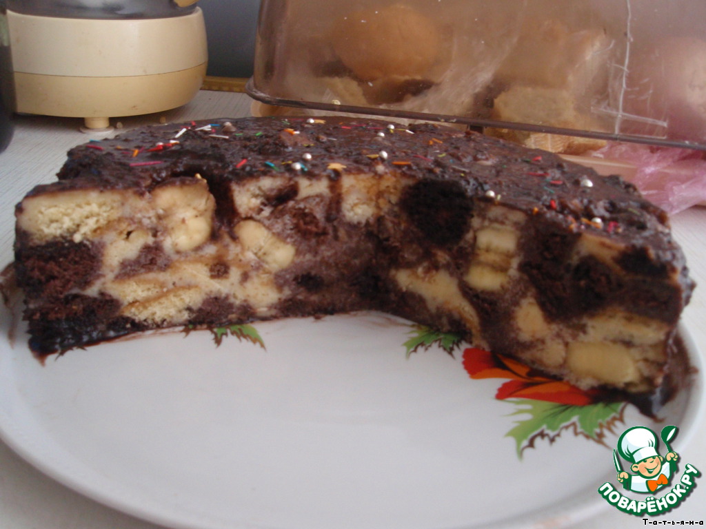 Заливаем нарезанные коржи с бананами этим кремом, тщательно перемешиваем. Выкладываем в форму и в холодильник.