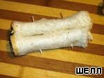 • Скатываем ломтики в рулетики и скрепляем их по 2 штуки зубочистками.