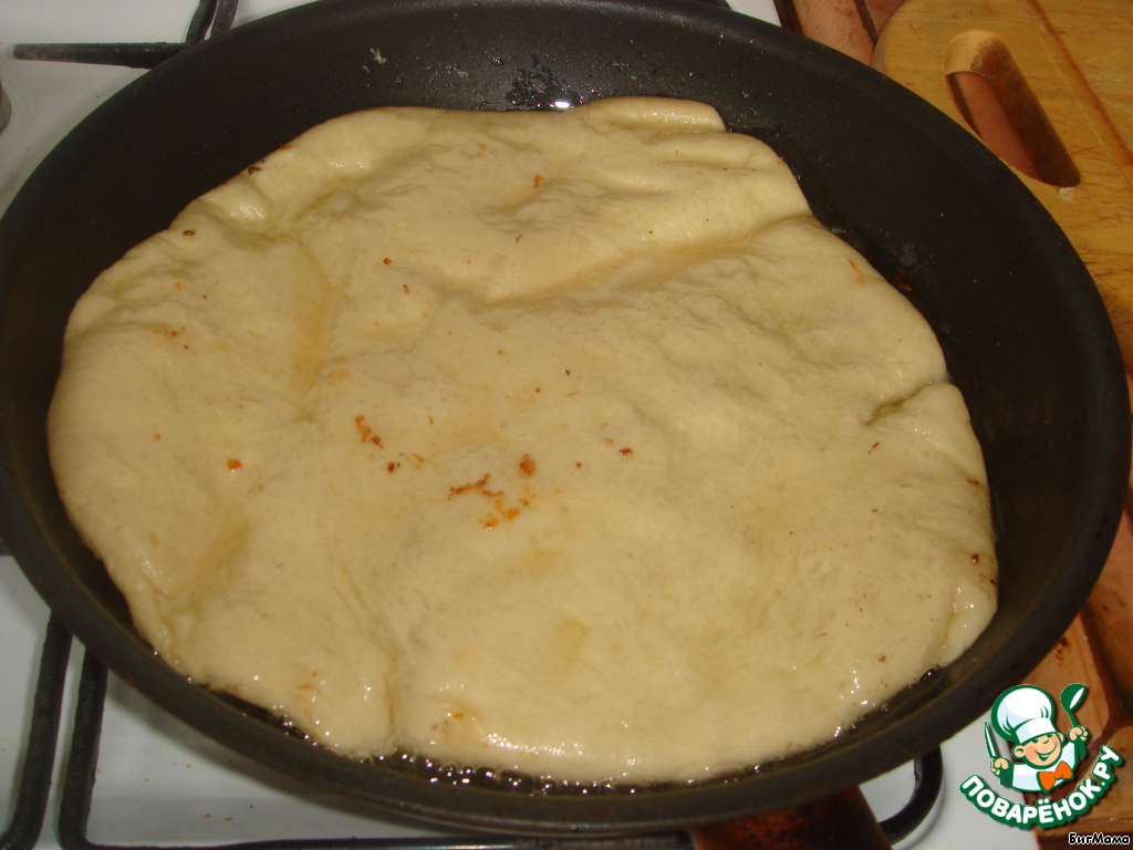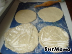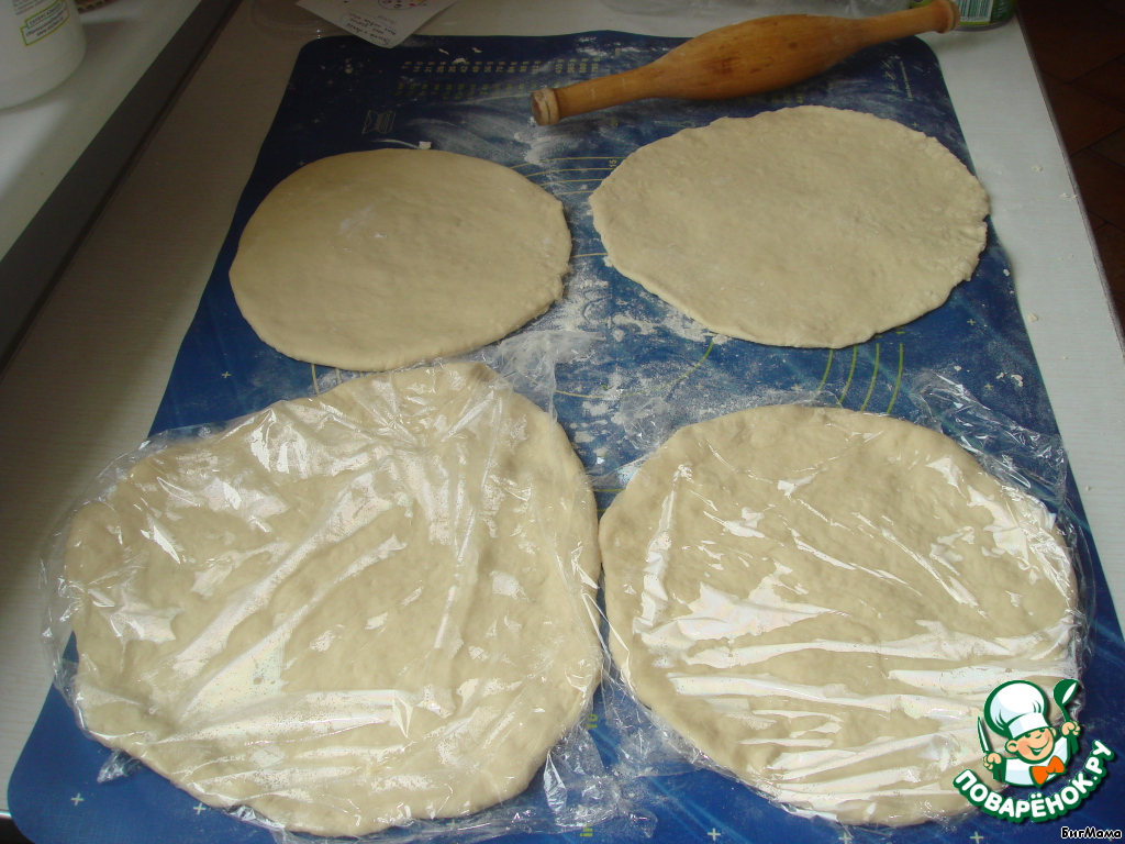 • 1. Тесто. Муку с солью просеять. Дрожжи, пудру и 325 мл. теплой воды смешать и оставить на 5 минут. Замесить эластичное тесто. Закрыть пленкой, оставить на 15 минут. Разделить на 4-6 частей. Растянуть руками в лепешку 0.5 см толщиной. Присыпать мукой и накрыть пленкой.