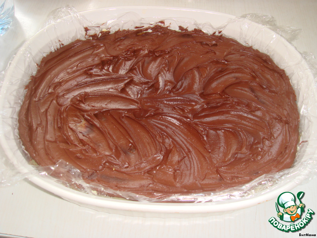 6. Остудить. Полить шоколадным кремом десерт. Отправить в холодильник на 30 минут.