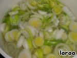 Порей нарезать и бланшировать в соленной кипящей воде 40 сек. Выложить на сито и обдать ледянной водой. Обсушить.