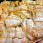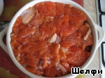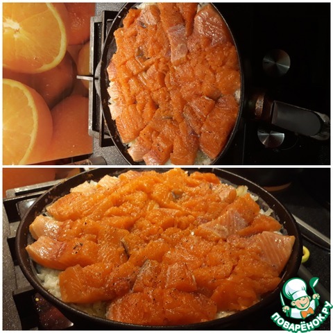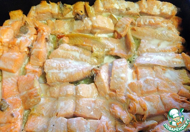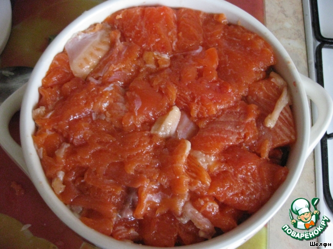 А на лук выложить небольшие кусочки свежей форели. Посолить.