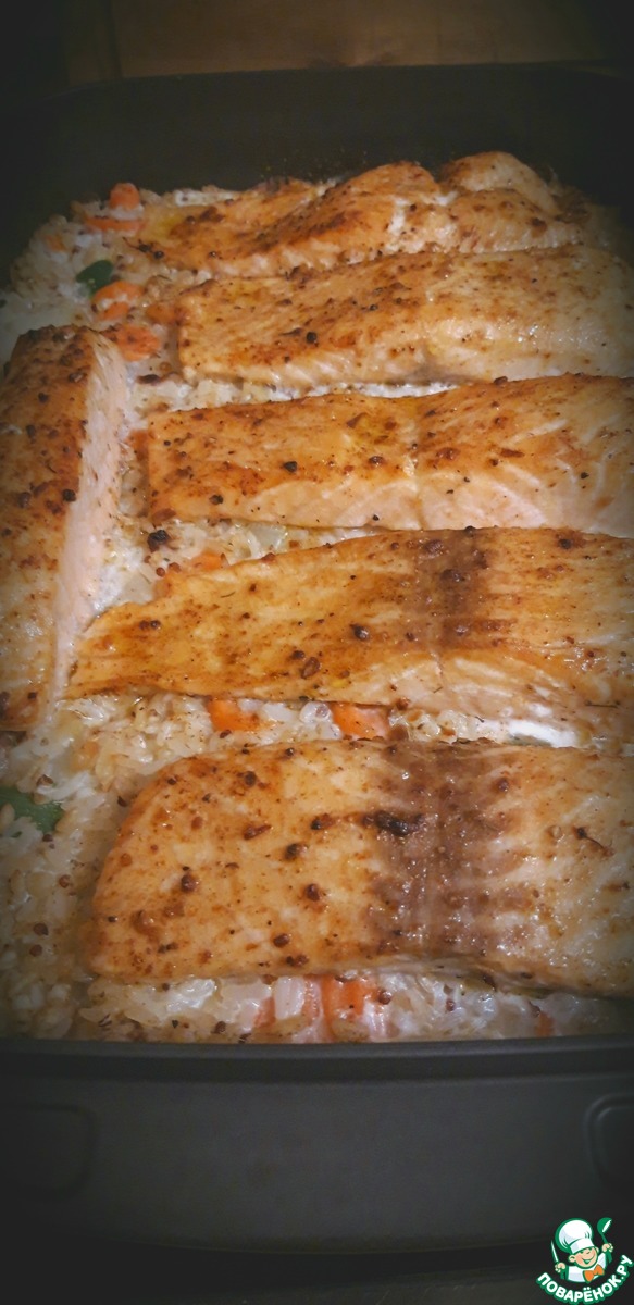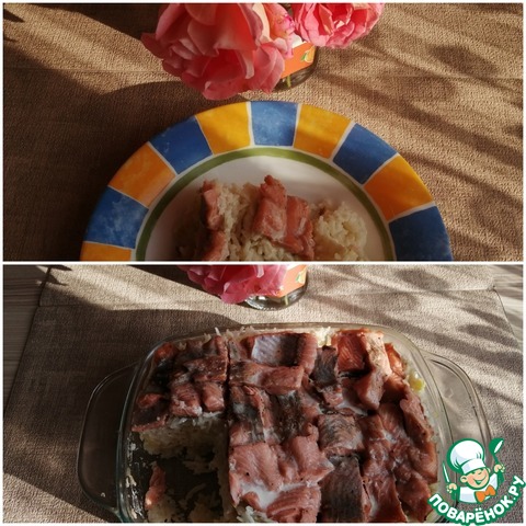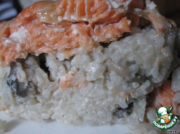 Вкусное и нежное блюдо для выходного дня! Гарнир из белого риса и шампиньонов, тушенный в сливках, покрыт нежным покрывалом из форели! Пальчики оближешь!
