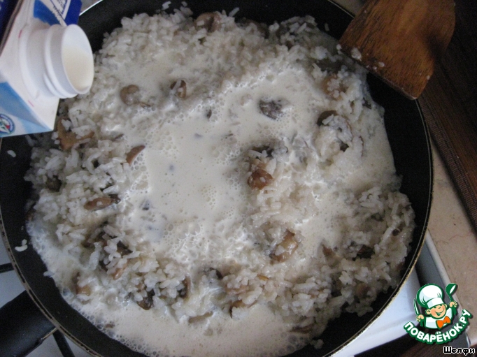 Смешать рис с грибами, посолить, залить сливками и дать немного потушиться (чтобы рис пропитался сливками, но все сливки не выпарились). Гарнир должен быть нежным и не сухим.