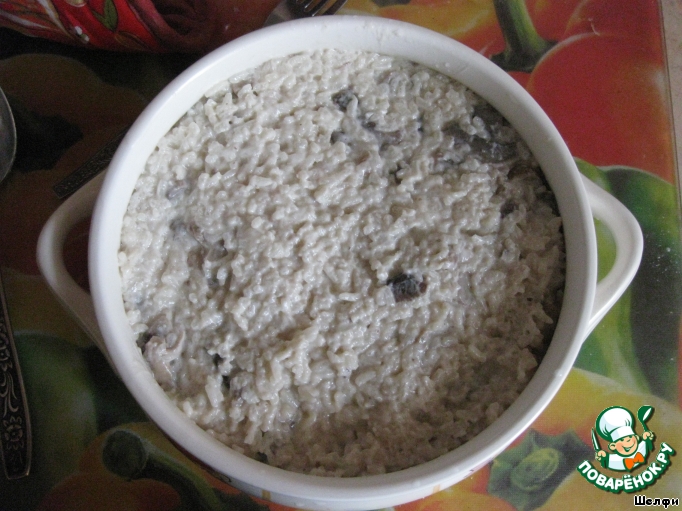 Выложить рис, тушенный с грибами и сливками, в жаропрочную посуду
