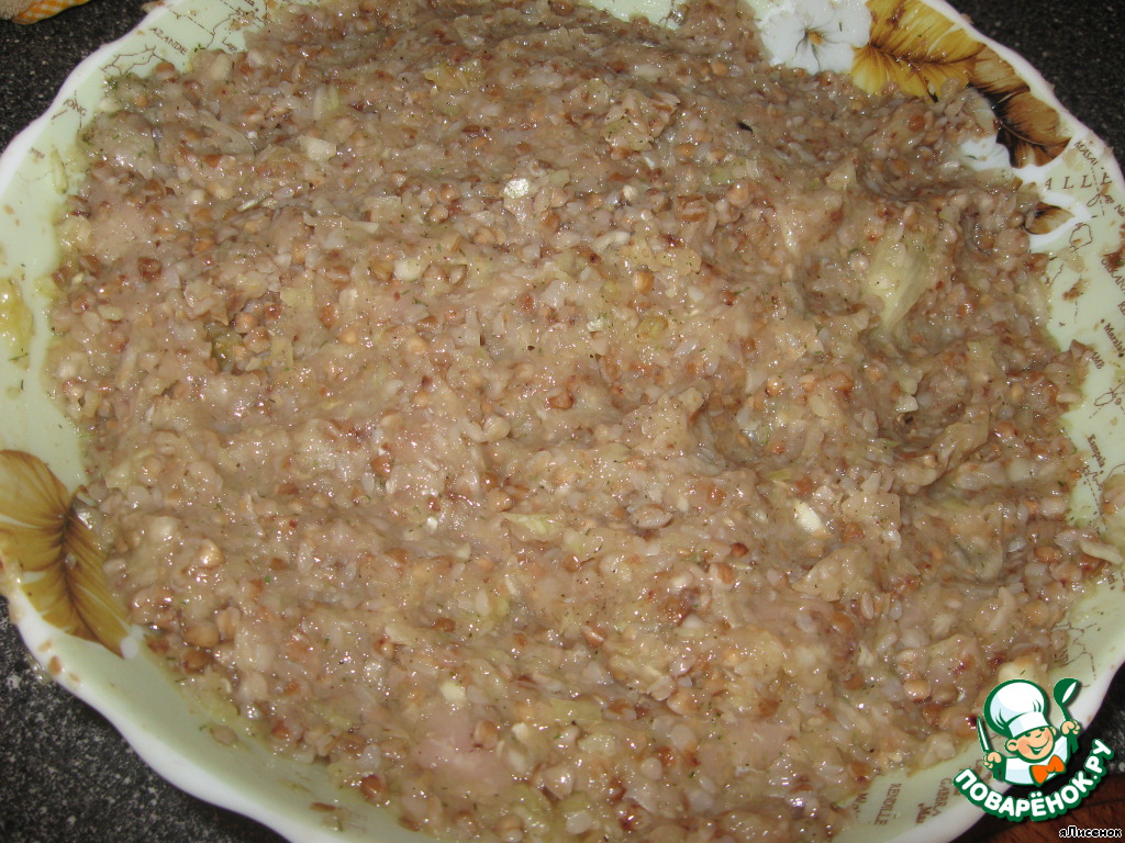 Отварить стакан гречки до состояния "почти готовая": 1 ст. гречки + 1,5 стакана воды, остудить.