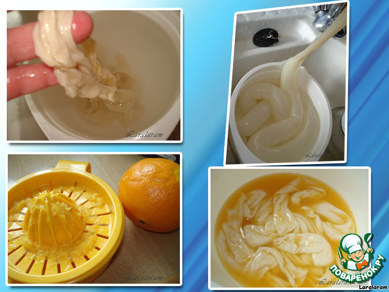 Процесс изготовления постараюсь как можно подробнее изложить, чтоб все могли к энтому счастию причаститься. Готовим кишочки - где их взять, если вспомнить все просторы необъятной Руси и стран СНГ - то не знаю: кто где - на рынке, на ферме, в деревне, наконец, в спец. магазинах и в интернете. В Германии с этим проще - их продают в спец. магазинах, уже подготовленные и законсервированные в солевом растворе. А можно заказать у мясника... Кишки промываю от соли - снаружи и внутри (для внутренней - пардон! - "клизмы" кишки надеваем на кран и пропускаем через них воду), а затем замачиваю в апельсиновом соке на несколько часов.