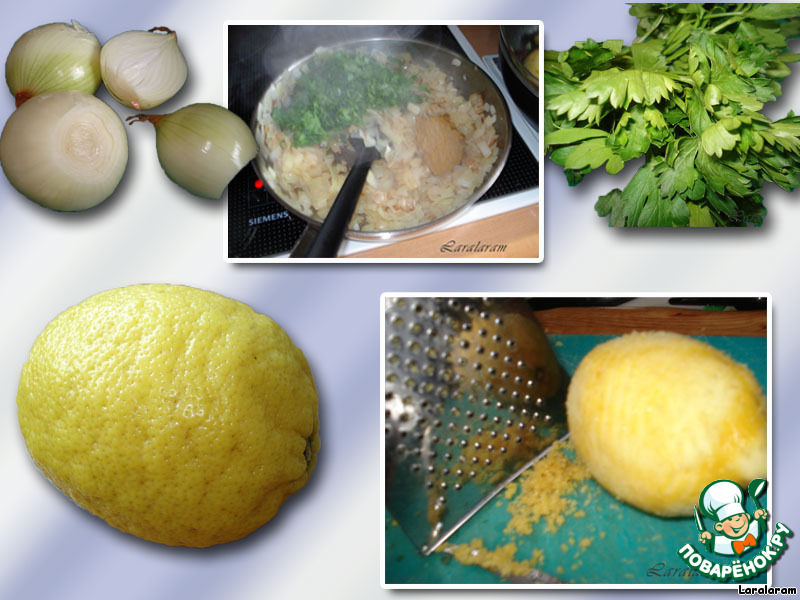• Нарезаю лук и петрушку, на растительном масле обжариваю лук до готовности, в конце добавляю карри и петрушку. Перемешиваю и даю остыть. Снимаю цедру с лимонов.