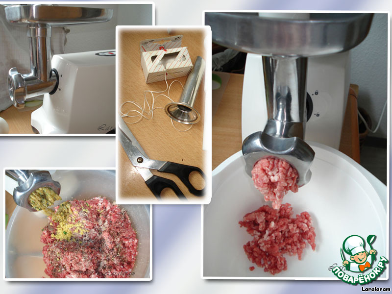 • Собираю мясорубку, кроме неё нам понадобится специальная насадка для заполнения кишок, ножницы и нитки... Перекручиваю мясо на фарш - не очень мелко, на средней решётке. Перекручиваю лук и цедру.