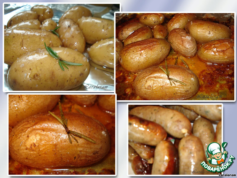 • Выложила на решётку, вниз поставила противень - а так как я предполагала, что будет колбаса вкусными соками истекать, то... На противень выложила картофель, смешанный с крупной солью, чесноком, розмарином и каплей оливкового масла. Запекаю при 180-190° до румяного цвета - колбаски хорошо бы один раз перевернуть на другой бочок, я не сделала, и они с одной стороны больше подрумянились, чем с другой. Хотя на вкус не повлияло... Но вы переверните!