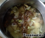 • Половину очищенного и нарезанного кубиками картофеля выкладываем в кастрюлю. Добавляем половину нарезанного мелкими кубиками лука.