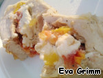 По одному краю (вдоль) подготовленной тушки выкладываем полоской желтый сладкий перец и кусочки томатов… Не забываем копченый колбасный сыр…Можно добавить немного майонеза или сметаны для пущей нежности…