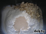 Загрузите все ингредиенты в форму для выпечки согласно инструкции к вашей ХП. В моем Мулинексе последовательность такова: вода, простокваша, соль, сахар, просеянная мука, фундук, дрожжи.