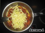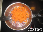 Минут через 5-7 кладем в лук морковь. Перемешиваем, тушим.