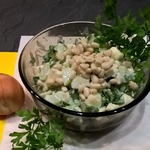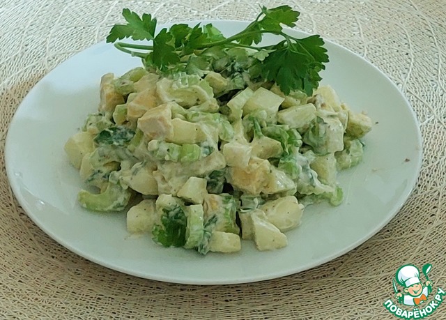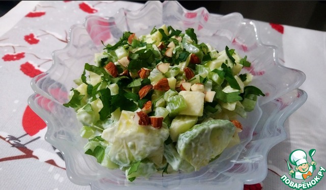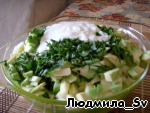 Добавить мелко нарезанную петрушку и заправить салат йогуртом.