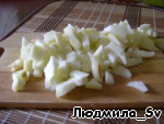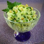 Очистить от кожицы авокадо, вынуть косточку и также нарезать кубиками.