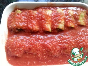 • Залить помидорами рулетики. И запекать в духовке при 180 град. около 45 мин.