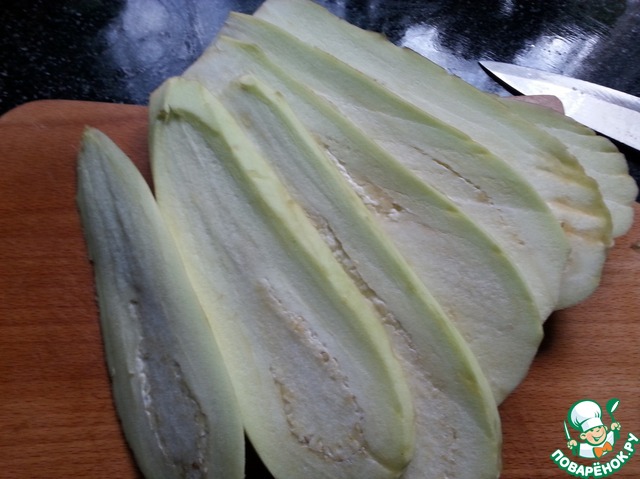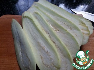 • Баклажаны отчистить и порезать вдоль на полоски толщиной 0,5см.