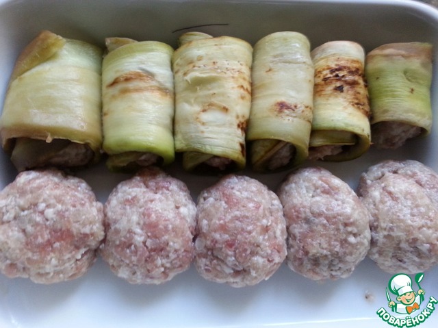 • В форму для запекания выложить рулетики ( у меня порция из одного баклажана и остальное тефтельки, т. к. мне баклажан нельзя.).