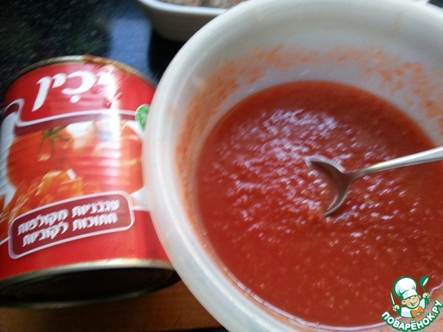 • Помидоры очистить от шкурки и пробить в блендере, или можно взять томат. пасту и развести водой ( У меня помидоры в собственном соку из банки). Посолить.