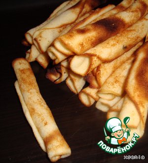 Когда по краям наши блинчики стали коричневыми, достаем противень. А в духовку ставим вторую партию, которую мы подготовили пока пеклось печень, а готовые сворачиваем в трубочки. Делать надо все очень быстро (печенье очень быстро остывает и сворачивается с трудом)