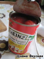 затем кладем помидорину, нарезанную как угодно (на данный момент не имелось у меня помидора и я использовала консервированные томаты), и недолго поджариваем на среднем огне (2-3 минуты)