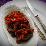 Выкладываем на блюдо. На этой же сковороде обжариваем красный горький перец, нарезанный длинными полосками, жарим без крышки. Перец должен быть будто подсушен. Выкладываем перец сверху говядины.