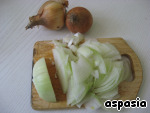 Лук репчатый нарезать полукольцами, обжарить на растительном масле до золотистого цвета
