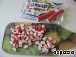 В салатницу или креманку положить зеленый лист, выложить салат и подать с майонезом и/или соевым соусом.