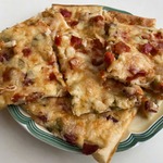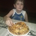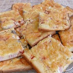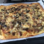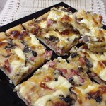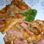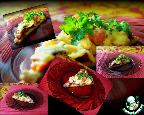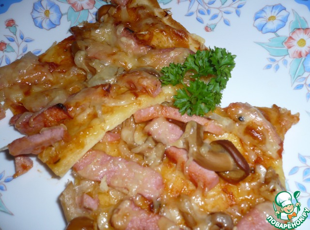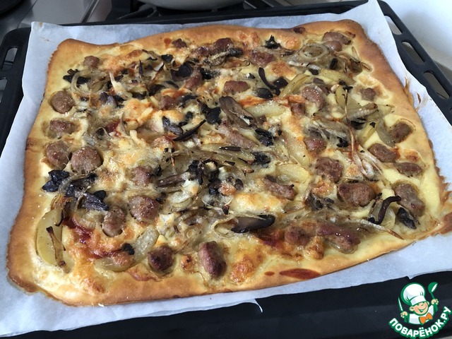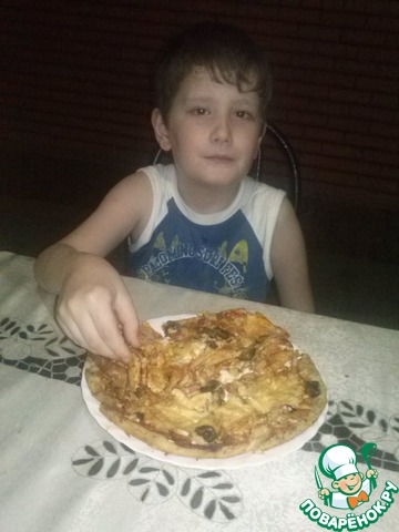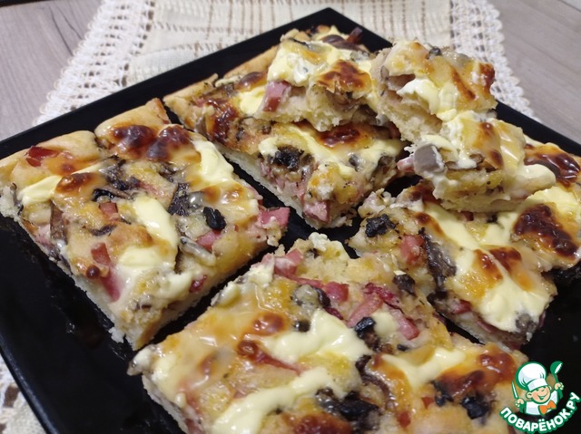 На тесто намазывал томатную пасту, горчицу французскую, ещё "зелень с чесноком" на блендере делали - даёт классный привкус. В тесто куркумы добавил, а после посыпал красного и черного перца. Все были довольны и вкус почти такой как в детстве попробовал у соседки. В следующий раз попробую свежие шампиньоны и наверное свинину заменю курицей, а также попробую добавить кунжута.