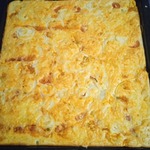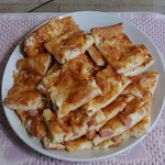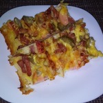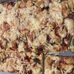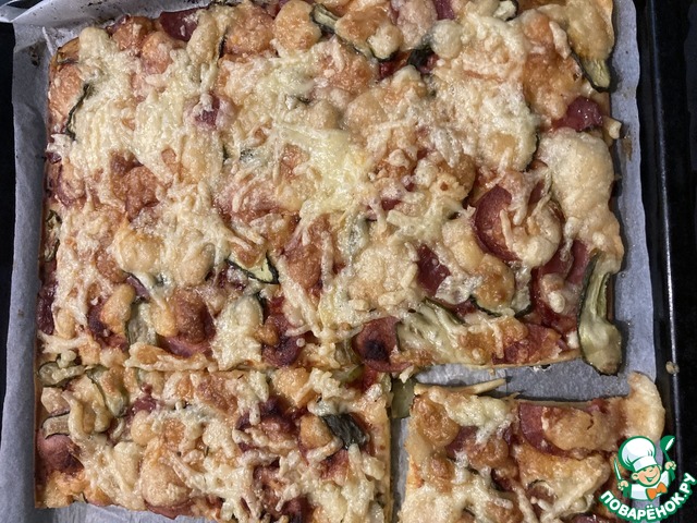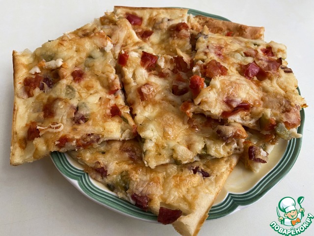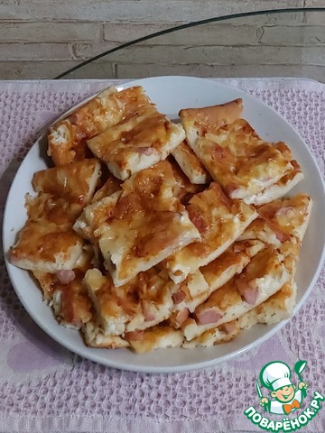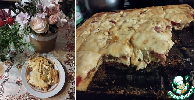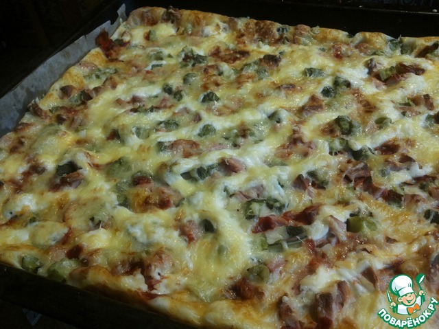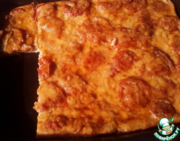 После выпекания достаем из духовки золотистую пиццу, режем на кусочки и снимаем ЛОПАТКОЙ!!Тесто очень нежное!!