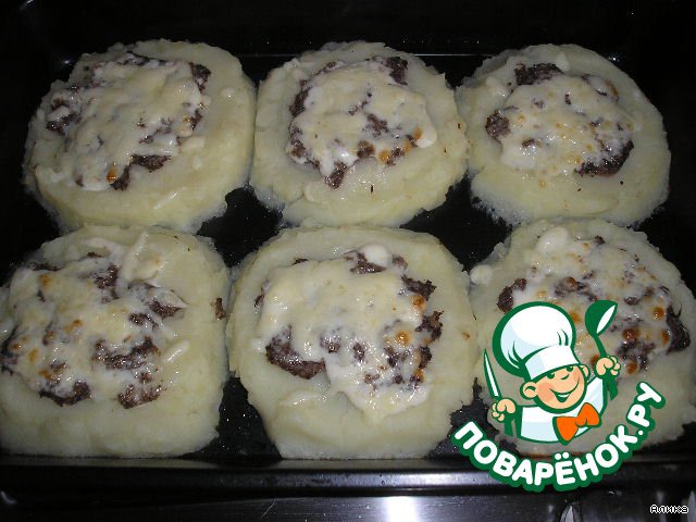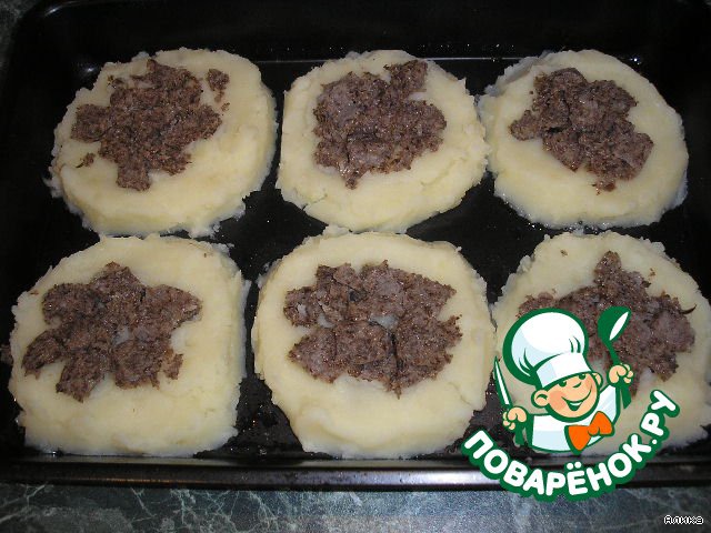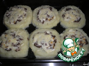 Выложить на противень картофельное пюре в виде круга, а в серединку – грибы.
