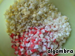 Добавляем к нашей \'нарезке\' вареный рис и сладкую кукурузу.