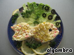 Подаем на листьях салата, украшенный оливками или маслинами.