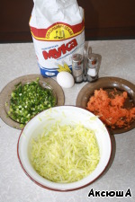 Натираем на средней терке кабачки, на мелкой - морковь, мелко рубим зелень.