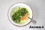 В смесь кладем зелень и морковь. Солим, перчим, перемешиваем.