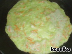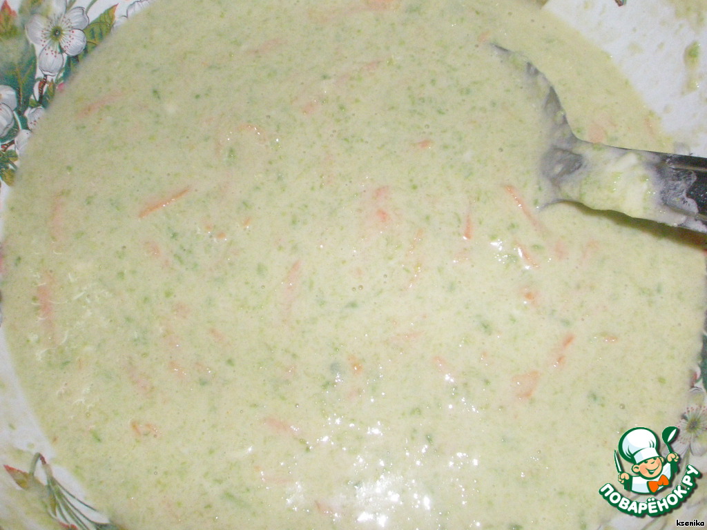 Тесто: на мелкой терке натереть кабачки и морковку, добавить 2 яйца, соду, соль, перец черный, кефир и муку.