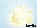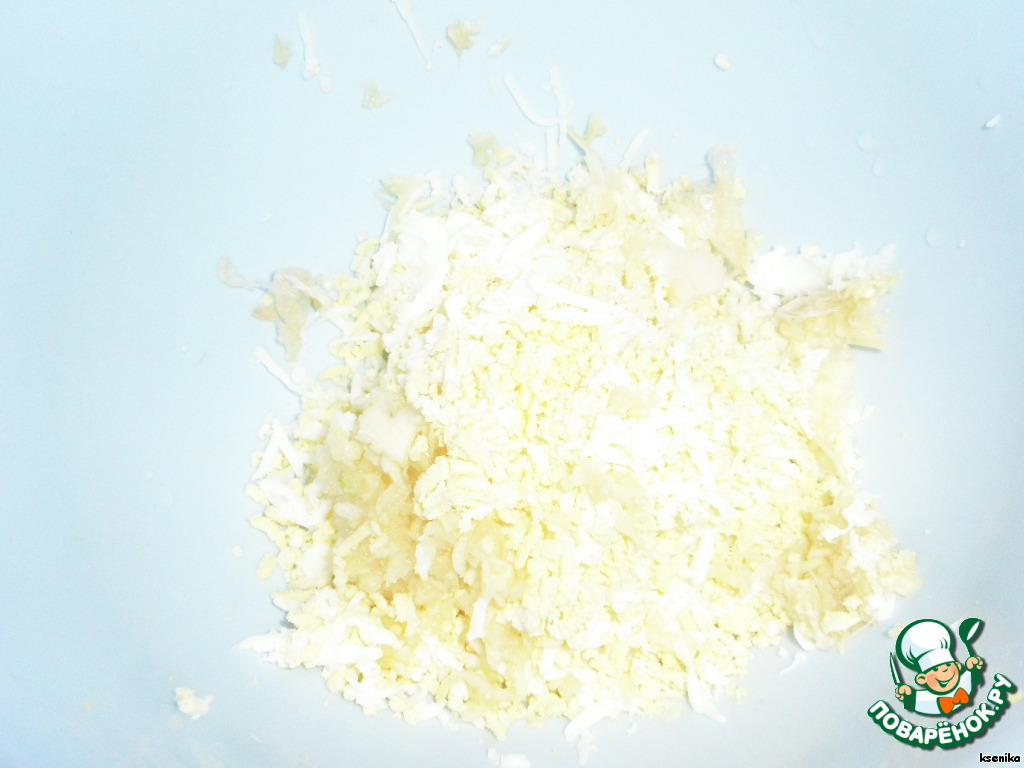 Пока жарятся блинчики, делаем начинку: 3 вареных яйца с чесноком трем на мелкой терке.