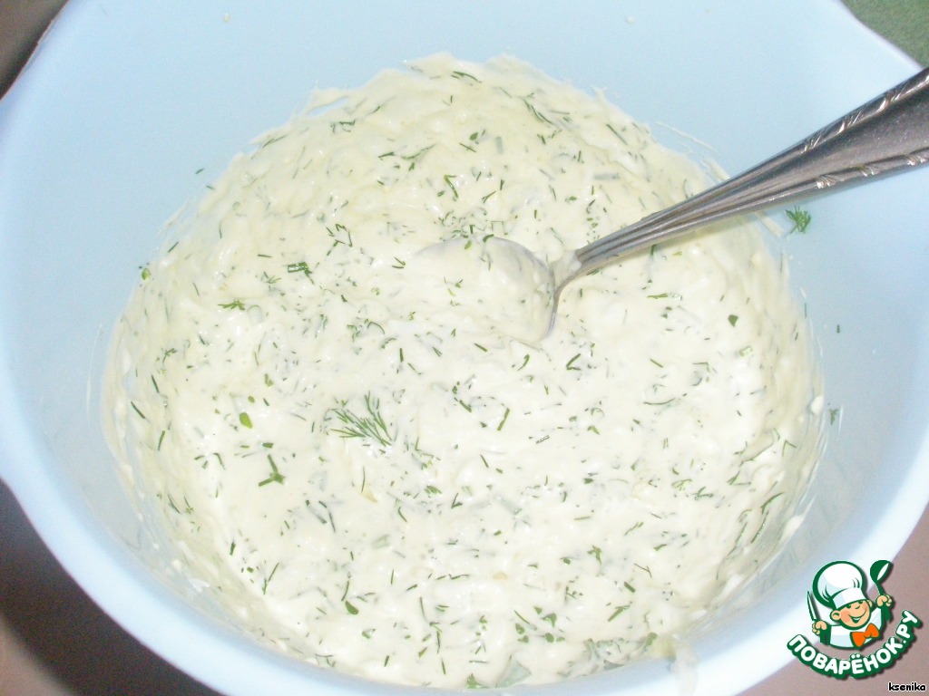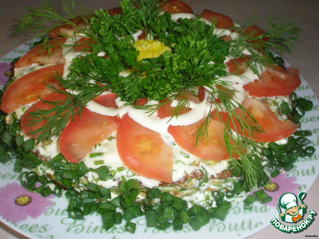 один блинчик мажем майонезным соусом, следующий грибами и т. д. -