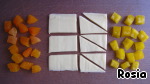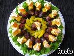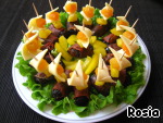 Насадить на шпичку сыр, курагу, сыр, перчик и воткнуть в рулетик.