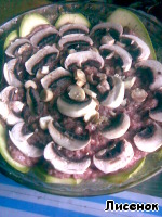 • Грибы почистить, нарезать пластинками, выложить поверх фарша.