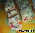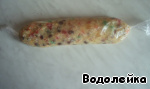 Потом эту массу выкладываем на пищевую пленку и формируем колбаску, хорошо запаковав ее в пленку.