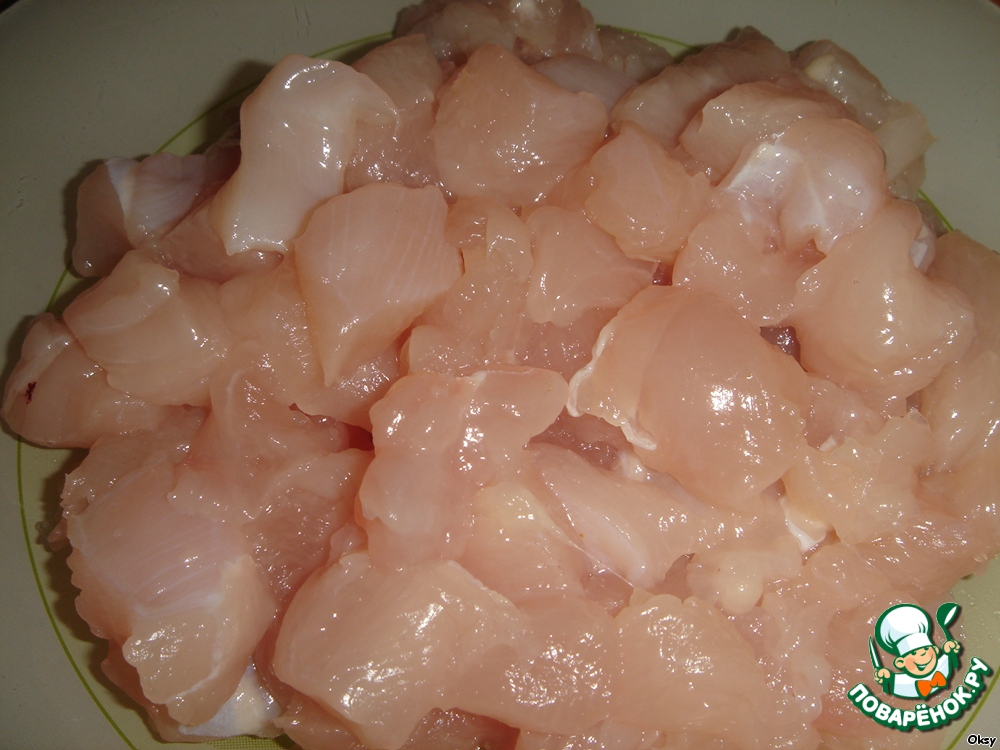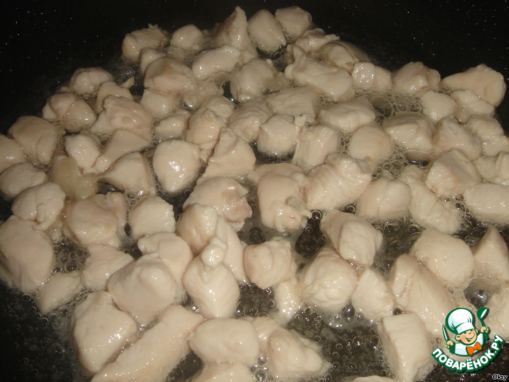 В сковороде разогреть растительное масло и обжарить кусочки курицы на большом огне в течение нескольких минут.