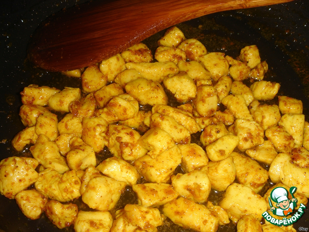 Когда кусочки курочки начнут зарумяниваться, посолить, поперчить, добавить карри и хорошо перемешать. Когда курица будет полностью готова, добавить винный уксус, перемешать. Затем снять с огня и остудить.