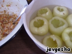 Перцы очистить от плодоножек и семян. Залить соленой горячей водой на 10-20 минут.