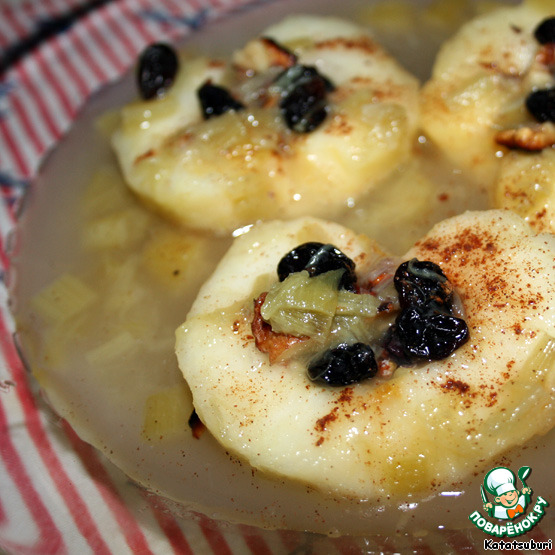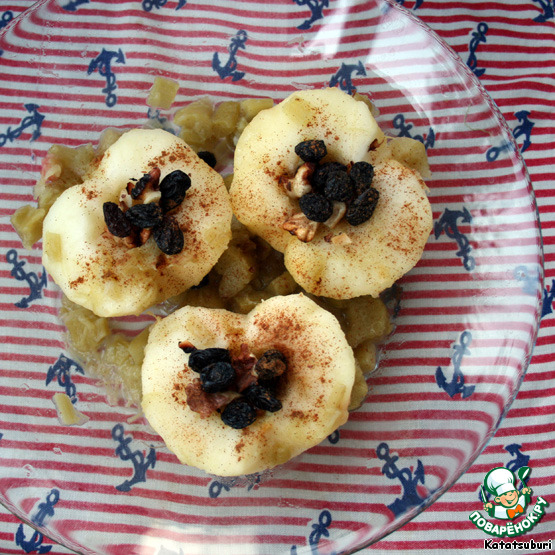 Тем временем (да, все мы многорукие индийские божества))) яблоки раскладываем в формы, на "подушки" из ревеня, присыпаем корицей, в ямки выкладываем начинку - орехи и изюм.